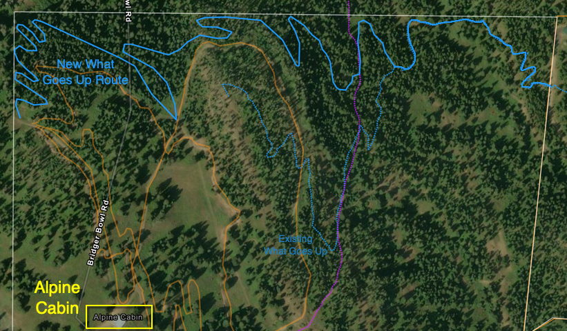 On the map here, you can see where the trail is in relation to Alpine cabin, Bridger Bowl’s parking area, and Crosscut’s Biathlon Range.